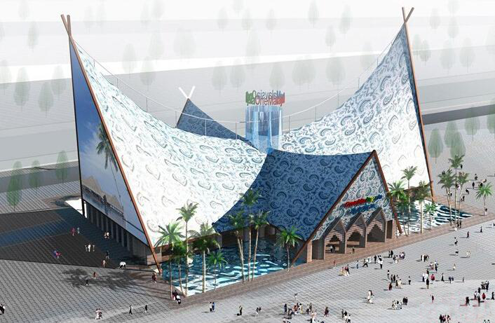 馬來西亞館將采用可循環(huán)利用的油棕、塑膠等材料建筑而成,重點展現(xiàn)馬來西亞的獨特風情和團結(jié)的民族精神。展館的設計靈感源自馬來西亞傳統(tǒng)建筑。整個展館由兩個高高翹起的坡狀屋頂組成,猶如一艘遠航而來的"木船";屋頂尖端的交叉構(gòu)架是馬來西亞本土建筑的特有符號;觀光電梯被設計成吉隆坡"雙塔"摩天樓形狀。參觀者不僅可以領略馬來西亞檳城、馬六甲等世界文化遺產(chǎn)的魅力,體驗普通馬來西亞家庭的樂生活,還能欣賞到特色藝術品及其制作過程。