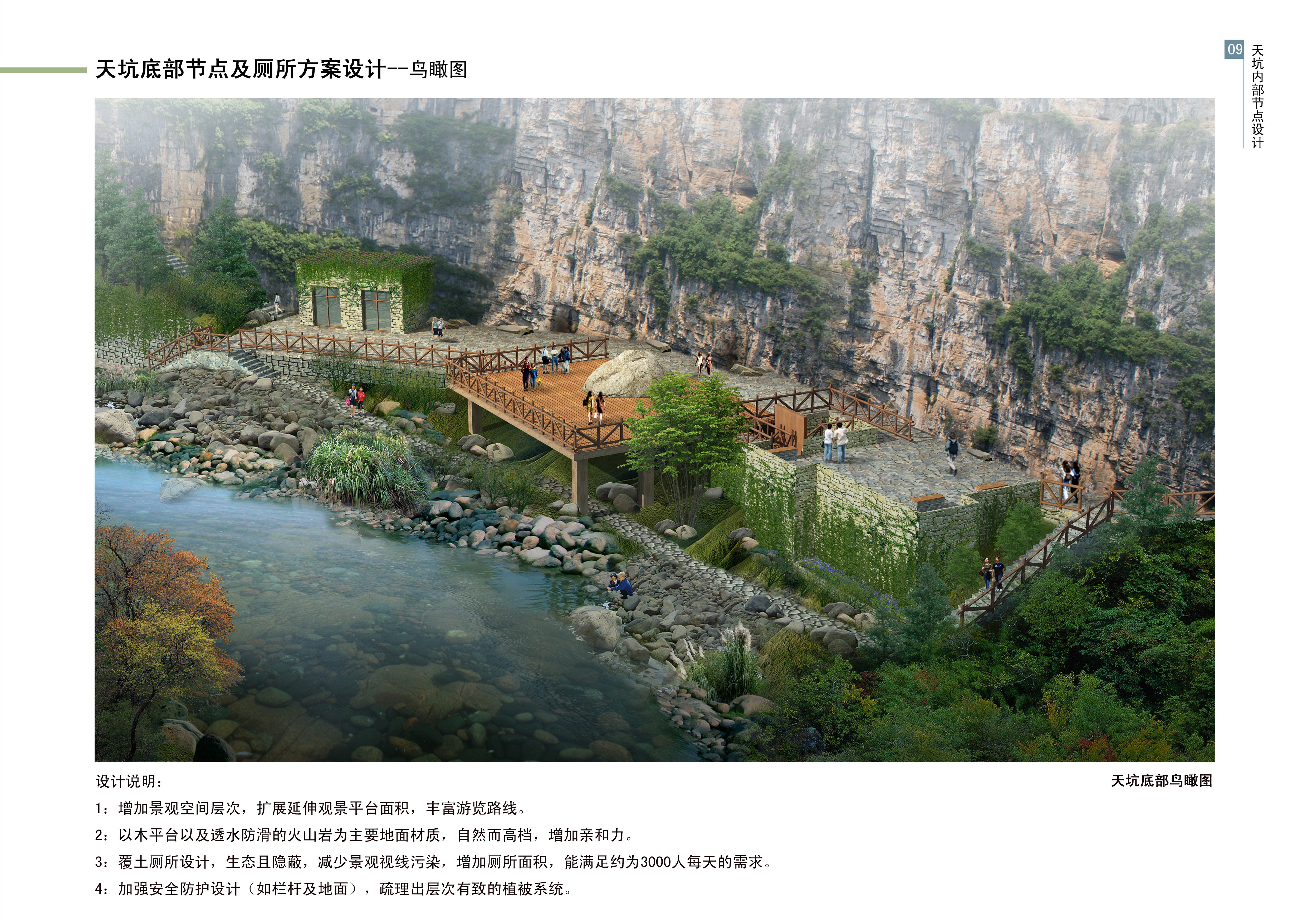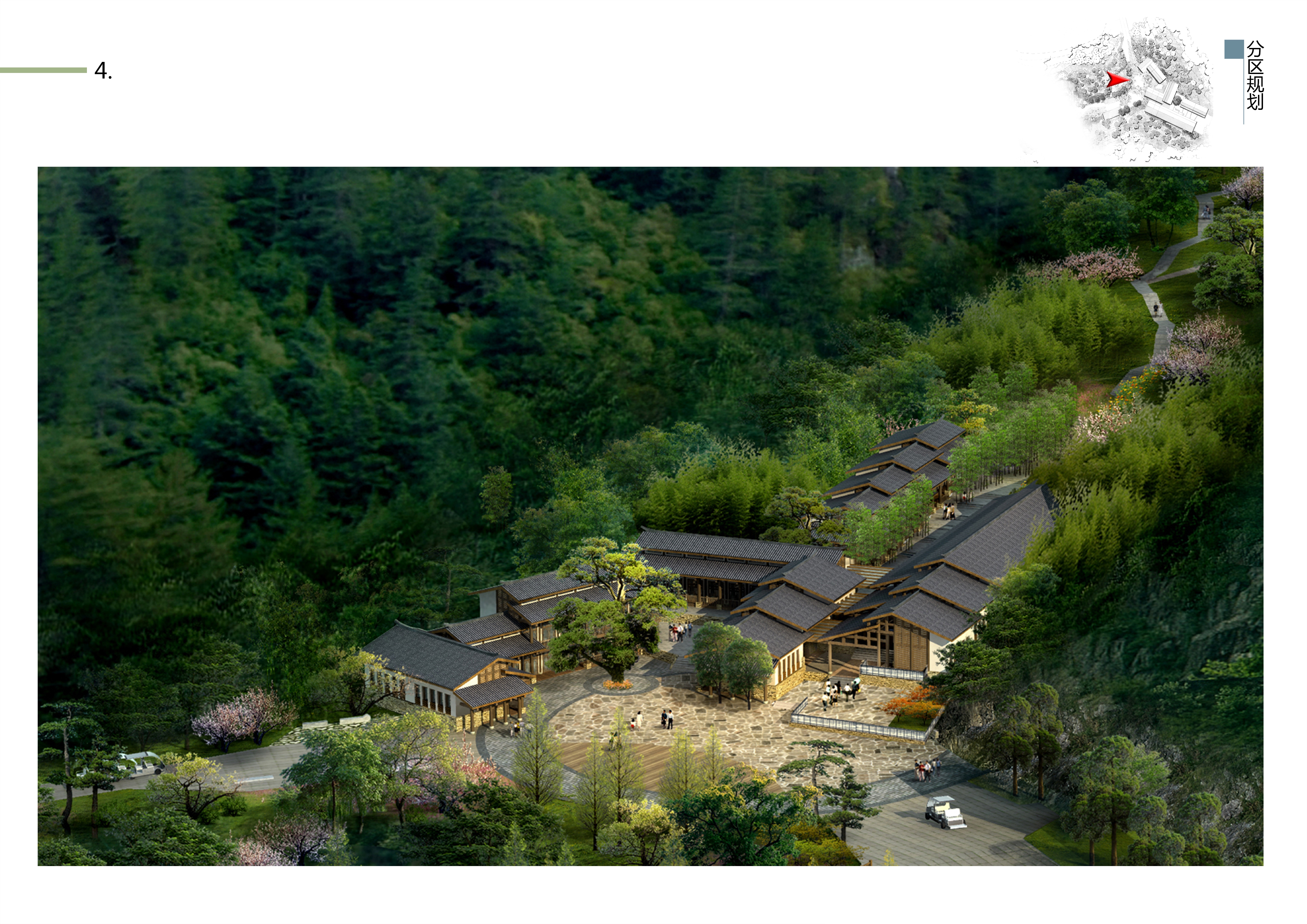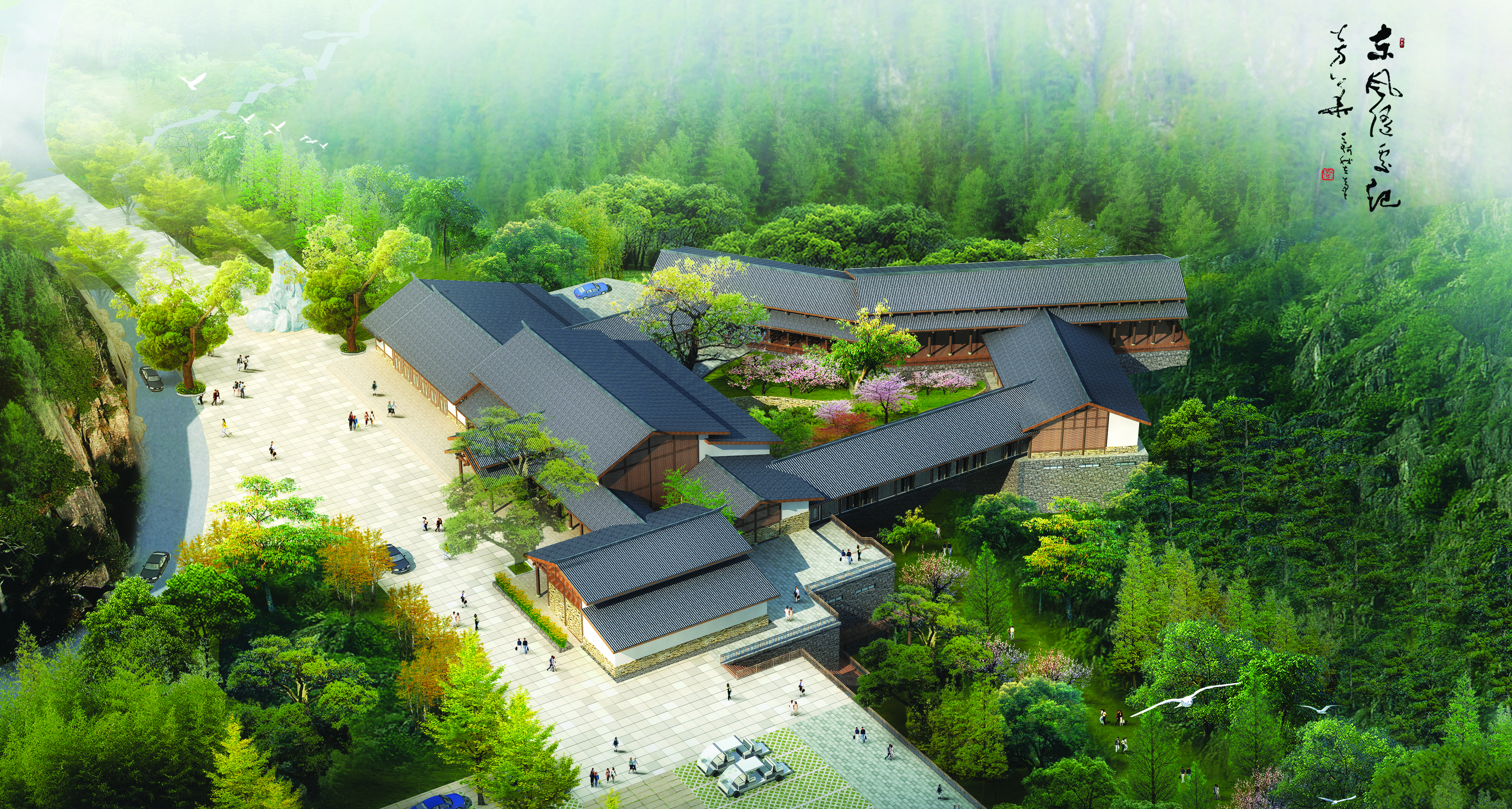 項目遵循“高起點、大視野、大旅游”原則,通過機構科學、嚴謹的咨詢方法和工具進行整合、提煉和分析,提出了“生態優先”、“國際發展”、“集群發展”、“項目拉動”、“和諧發展”五大策略,擬定“天坑地縫·天地人和”的主題定位。充分尊重現狀、利用現狀,采用軸線布局手法,形成本項目“一核一軸·三大片區”的布局結構。