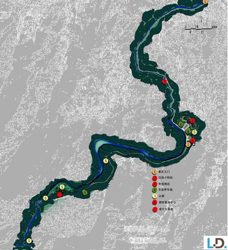 入口服務(wù)區(qū):設(shè)置游客服務(wù)中心、度假酒店、停車場以及相應(yīng)公共服務(wù)設(shè)施,打造龍津溪地的門戶形象。